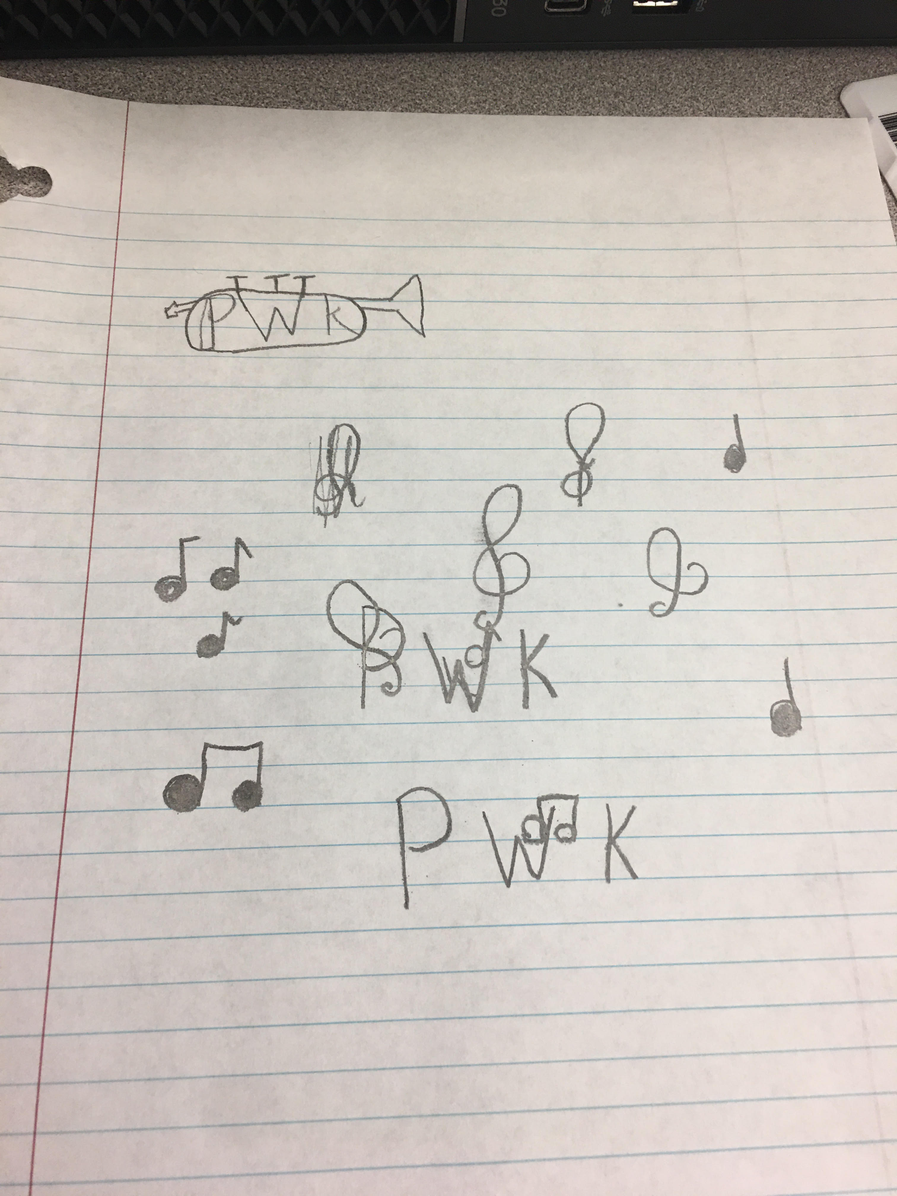 So since I love music so much I decided to put it into my logo for me. So I started drawing and designing. In the top left I thought it would look pretty cool if I put my initials inside my instrument. I didn’t really like the design and I couldn’t find a good way to make it work. This is where I had the idea to keep my initials to represent me and add music notes. I started with the two quarter notes and sixteenth notes and kind of had the scattered. I then added the treble clef and thought it would be pretty cool if I had the stem looping through the “P”. I was later given the idea to have the sixteenth note go around my “W” this made me decided to put the measure lines around my initials and the notes. I did this because I wanted to show how music surrounds me and my life, and the music notes show how intertwined I truly am with music. This was a fun assignment to work on and I’m super happy with the results.